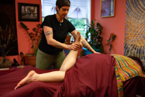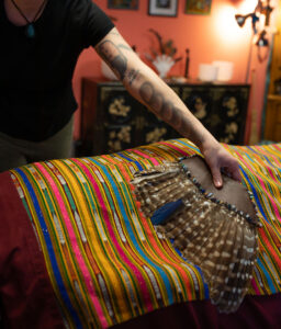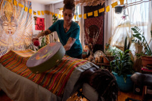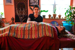 You can choose the offering you feel most called to & I can adapt to what you need that day. There are always crystals in the room & under the massage table to help with our work. I make my own Balsam Fir infused massage oil to aid in the healing. I also incorporate drumming, rattles, chimes & crystal singing bowls into every session. My office is a living altar, an art installation, a temple sanctuary. I would love to share healing with you in this dedicated sacred space.